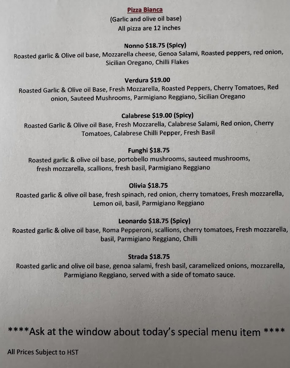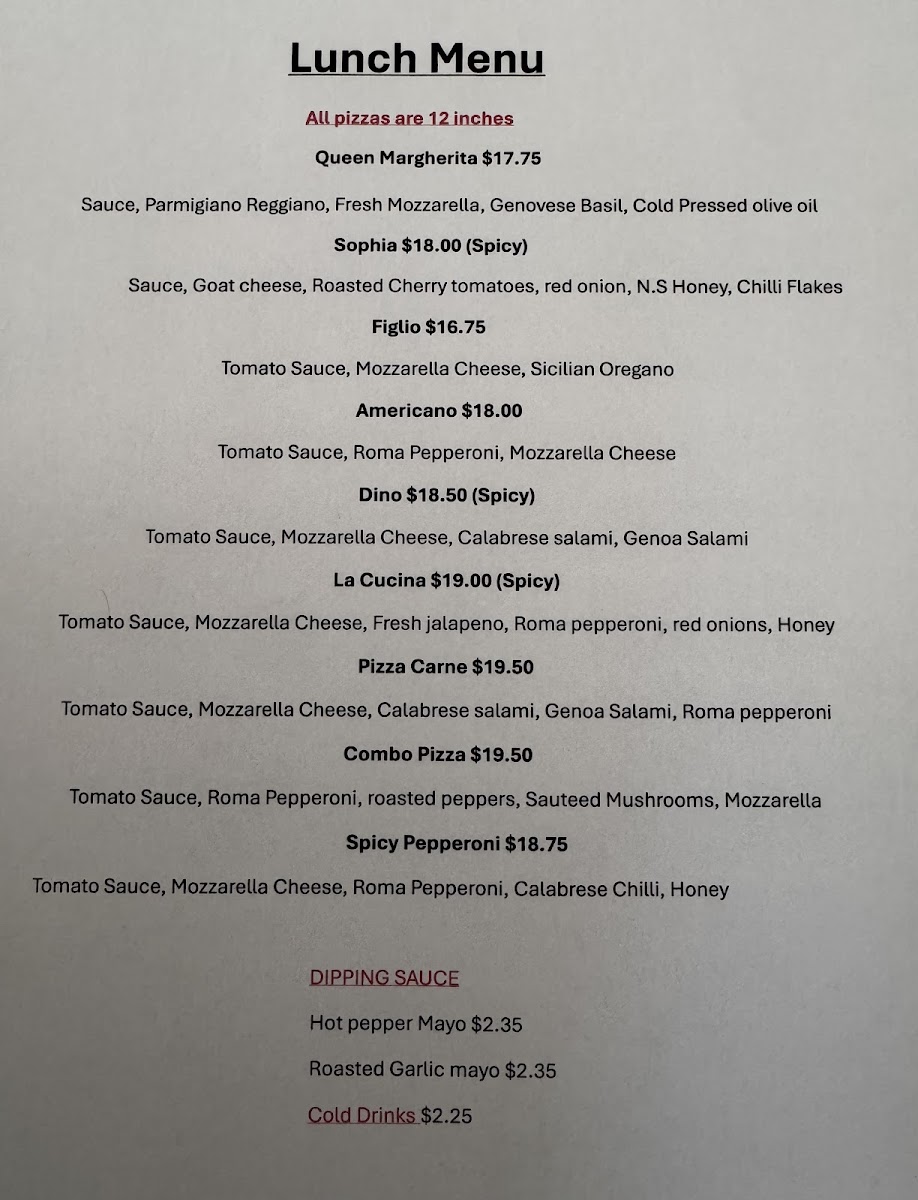 Highlights like the Queen Margherita showcase classic flavors with fresh ingredients, while options such as the Spicy Pepperoni or Pizza Carne bring a bit more depth and heartiness for those seeking something more robust. The menu also includes thoughtful accompaniments like dipping sauces—Hot Pepper Mayo and Roasted Garlic Mayo—that complement the warm, chewy crusts and vibrant toppings.
